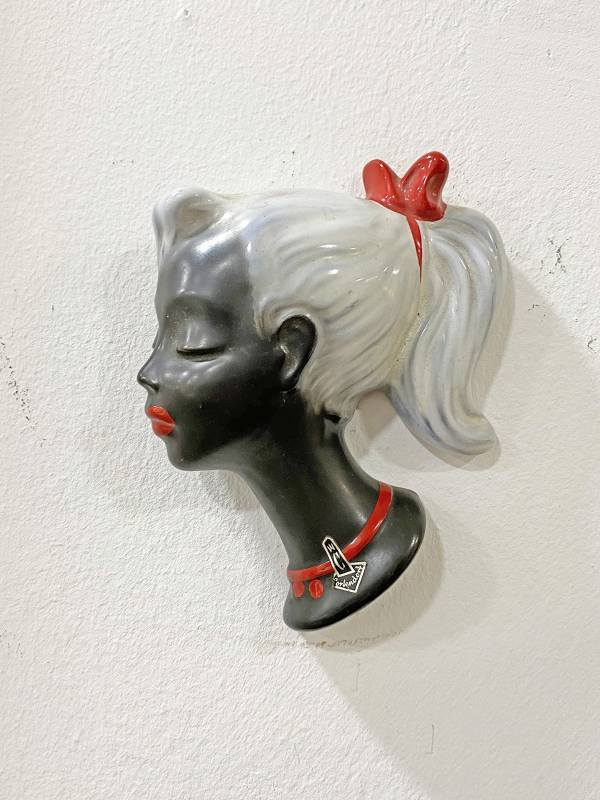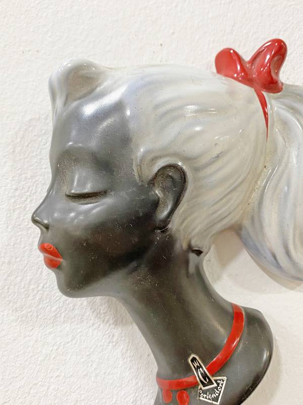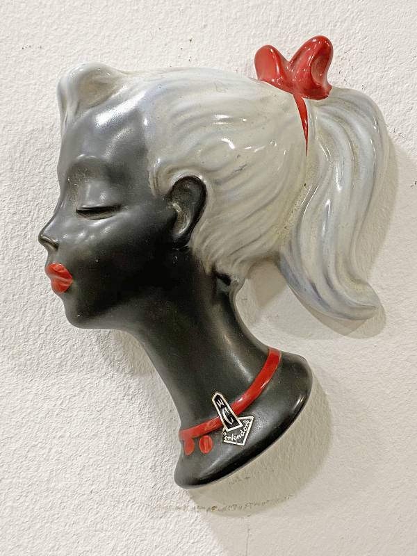1960 körül készült, kézzel festett kerámia. Kedves copfos kislány, inverzben. Fekete bőr, fehér haj. Érdekes darab.