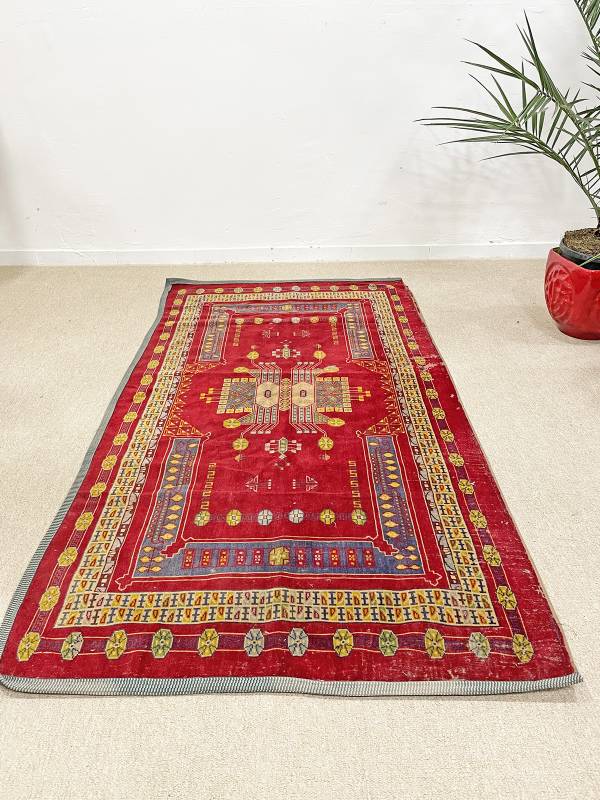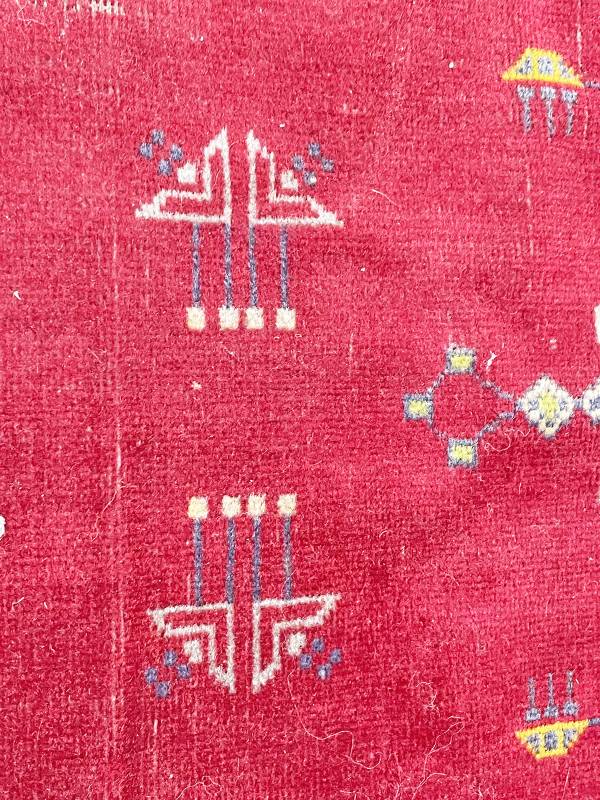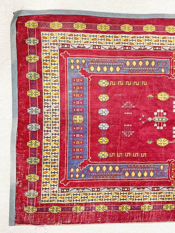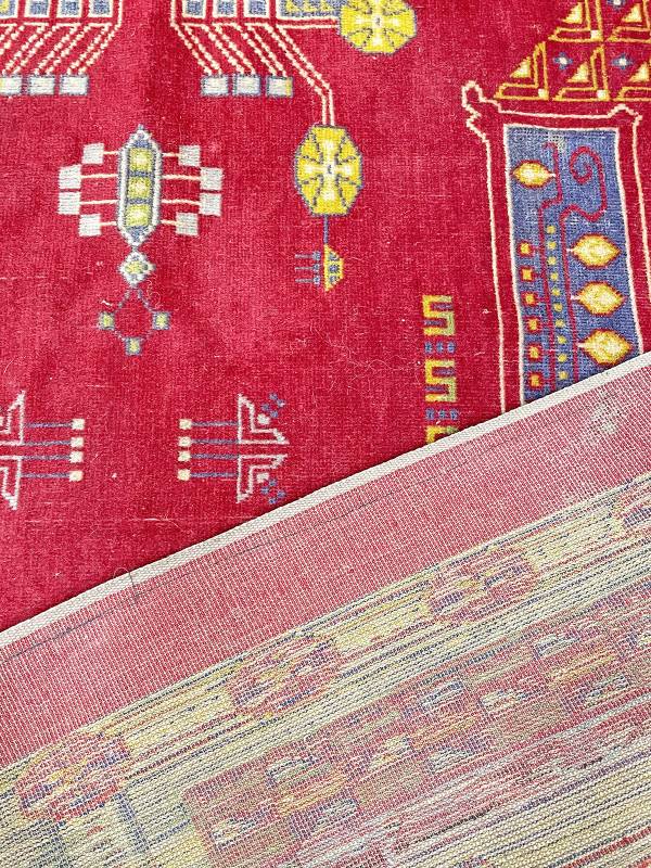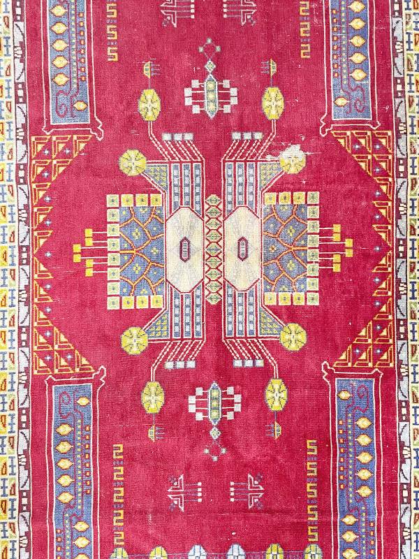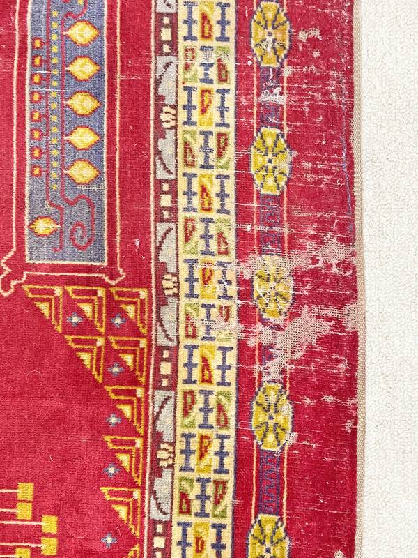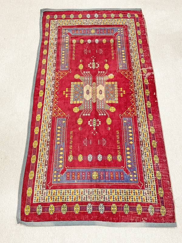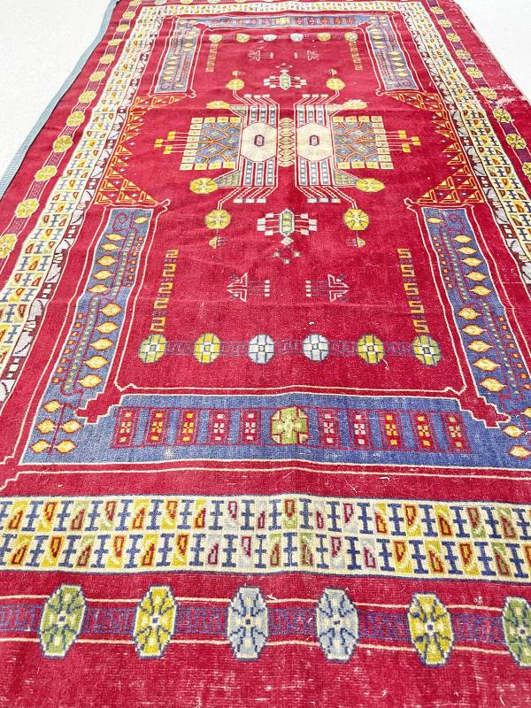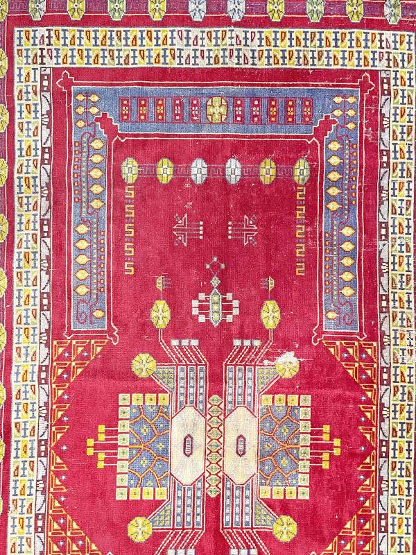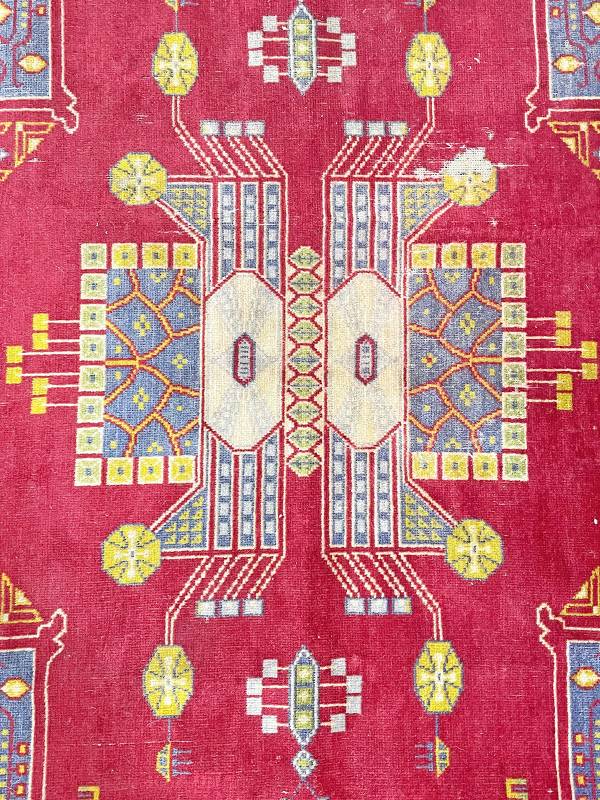 1910 körül készült, jellegzetes jugendstil faliszőnyeg. Mokett jellegű technika. Vörös alapon gyönyörű, stílus tiszta díszítés.