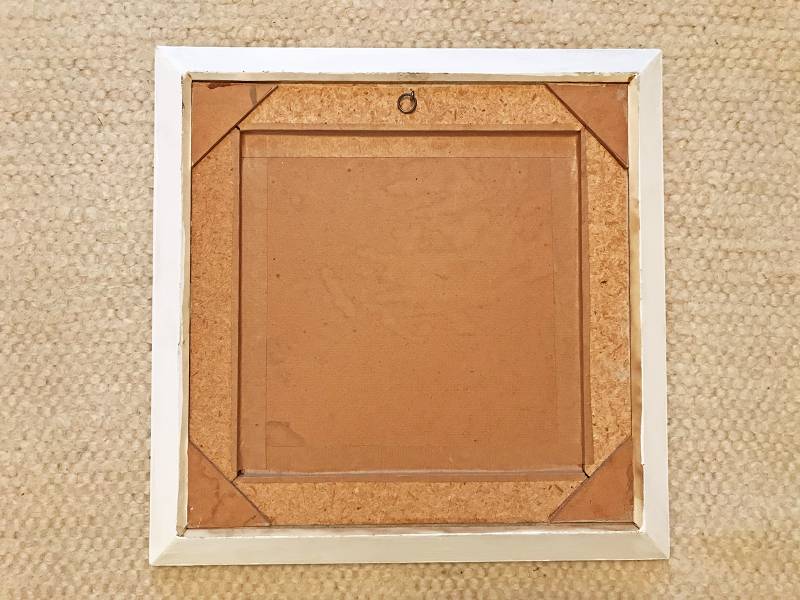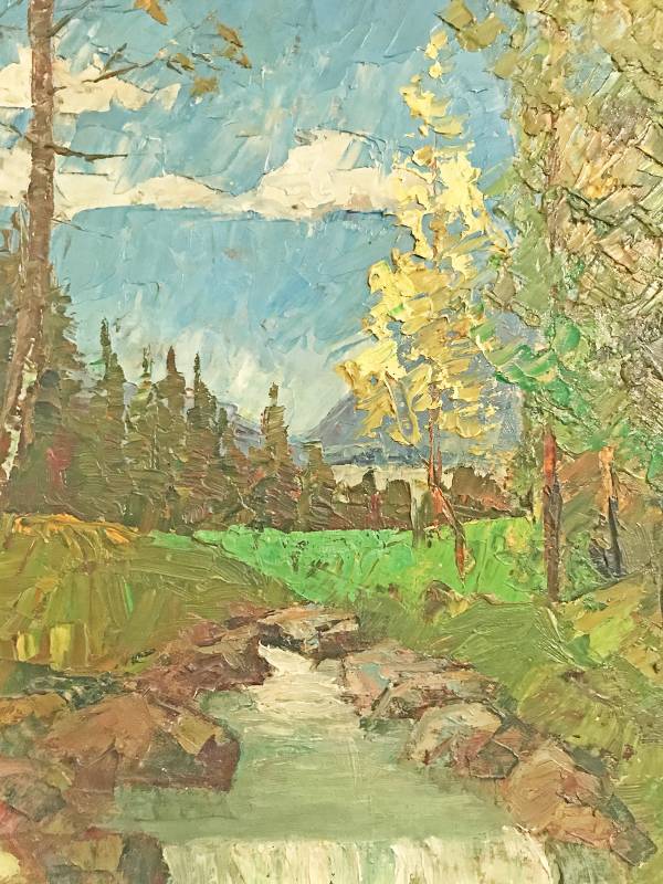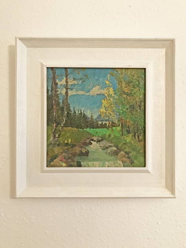1970 körül készült, olaj-karton festmény, fa keretben. Kellemes, nyári hangulatot idéző alkotás, sok türkiz kék színnel.