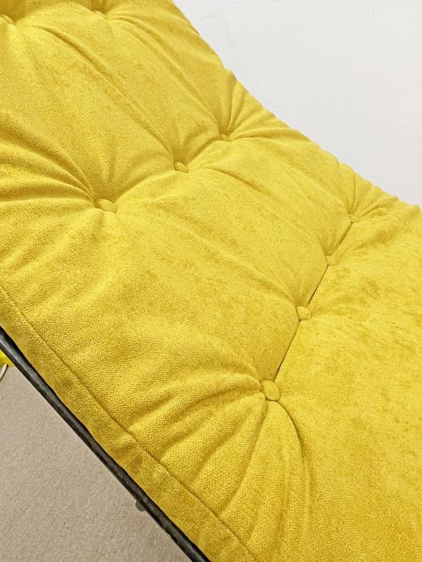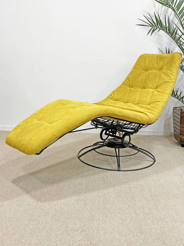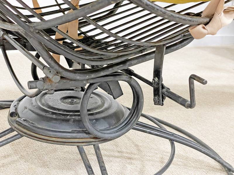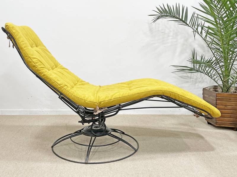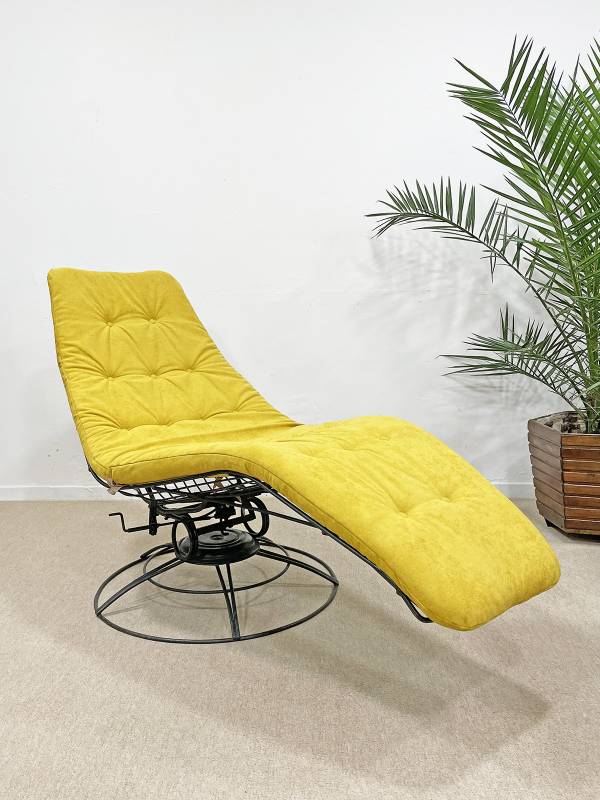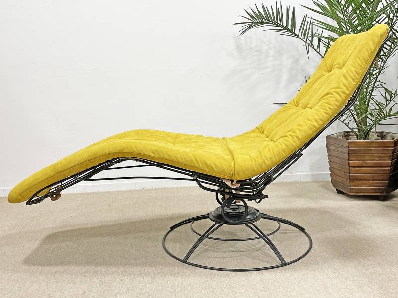 1965 körül készült, vas rácsszerkezetes, formatervezett banán nyugágy. Az amerikai Homecrest bútorkészítő vállalat ezzel, az ikonikussá vált, forgó-billenő mechanizmussal készült, rácsvázas terasz garnitúrával nyert teret és vált egy időre piacvezetővé a kerti garnitúrák területén az USA-ban.