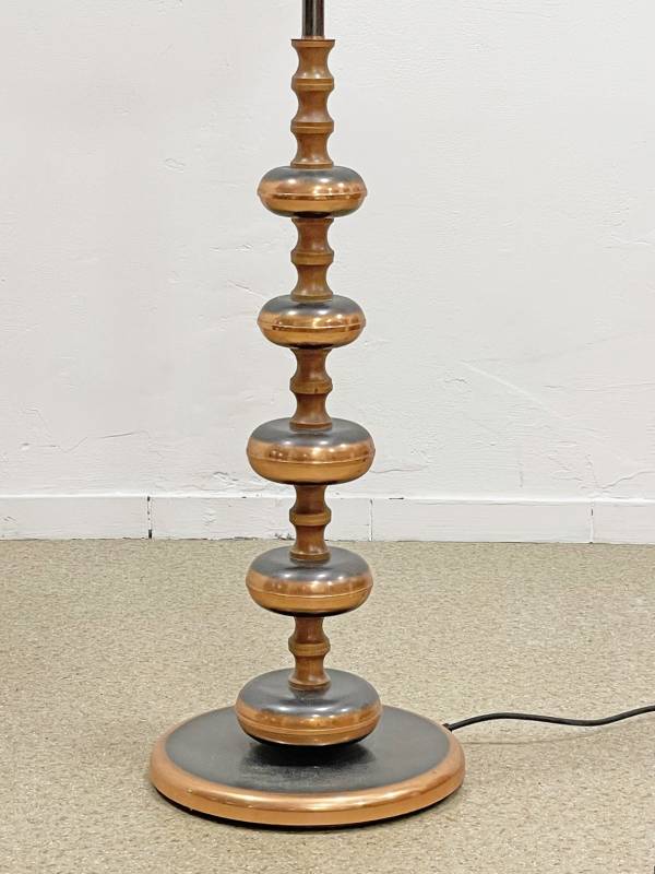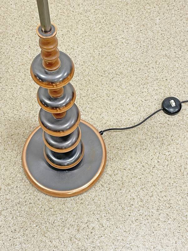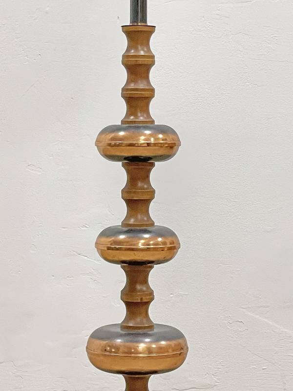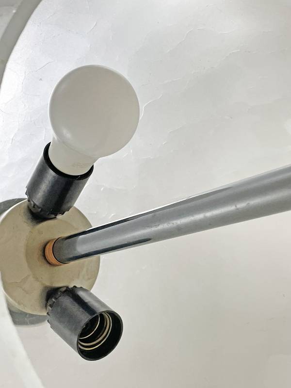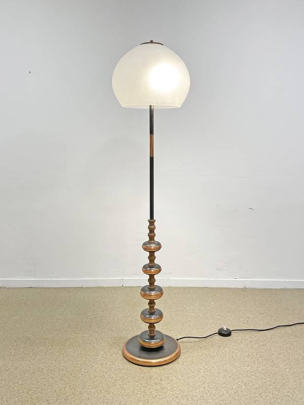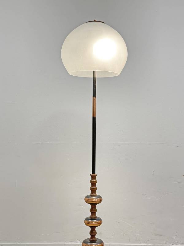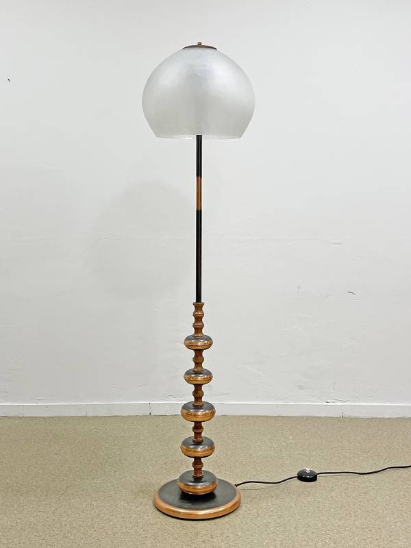 1965 körül készült bronz testű állólámpa repesztett üveg burával. Testén buborék díszítés. Üveg burája kellemes, tejes fényt biztosít.