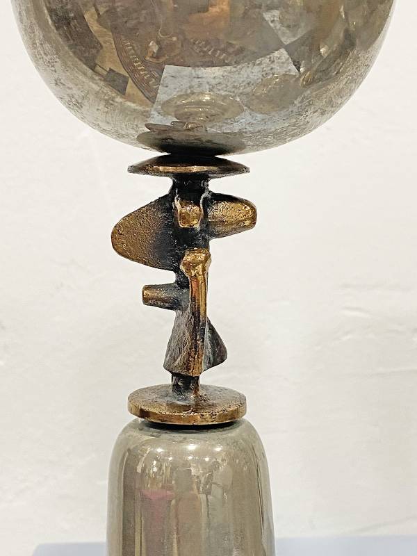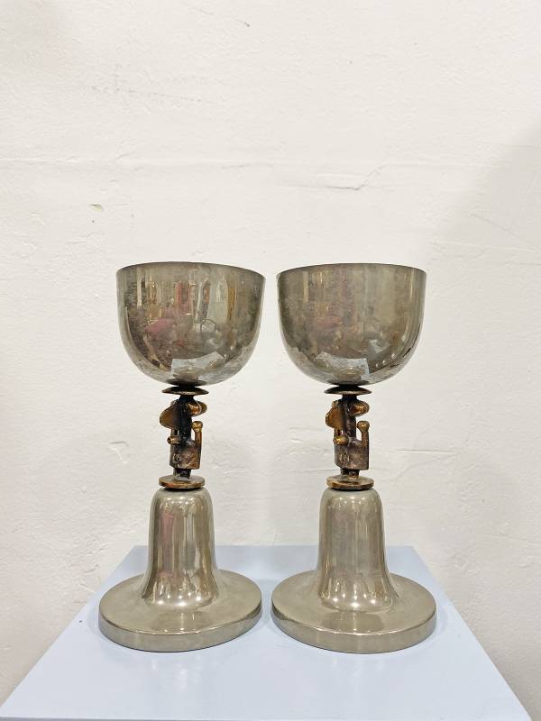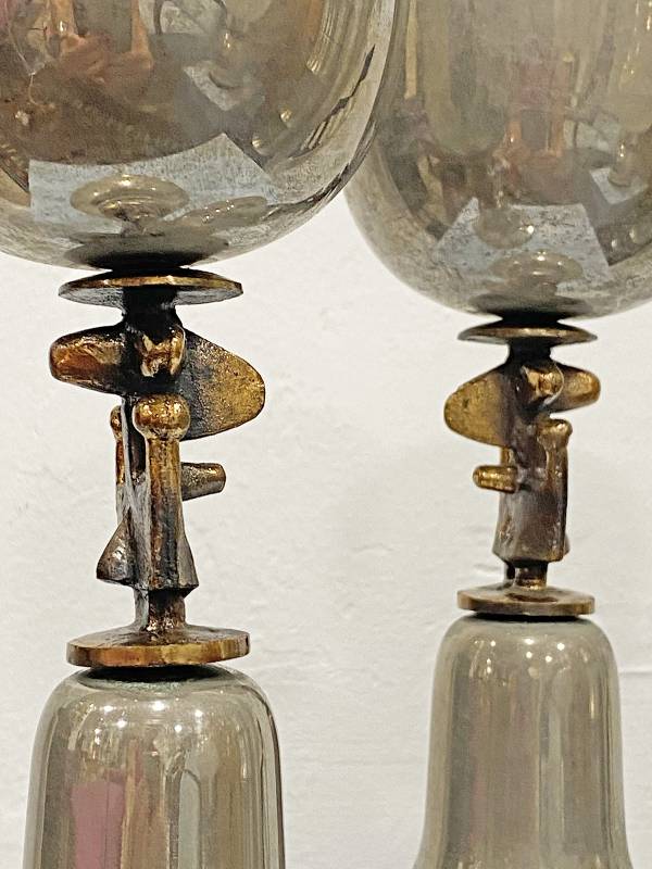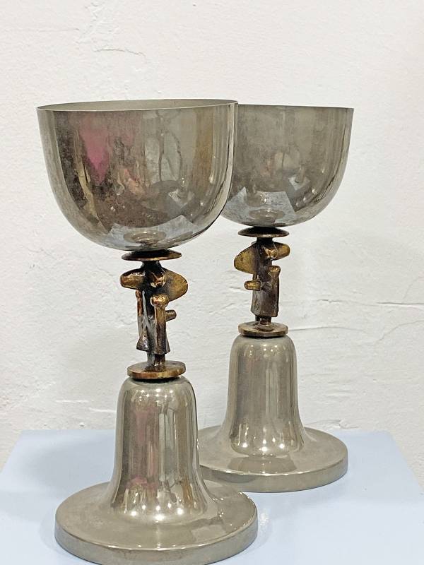 1965 körül készült, krómozott fém kehely pár. Nyakán stilizált, elképesztő formájú figurális réz plasztika.