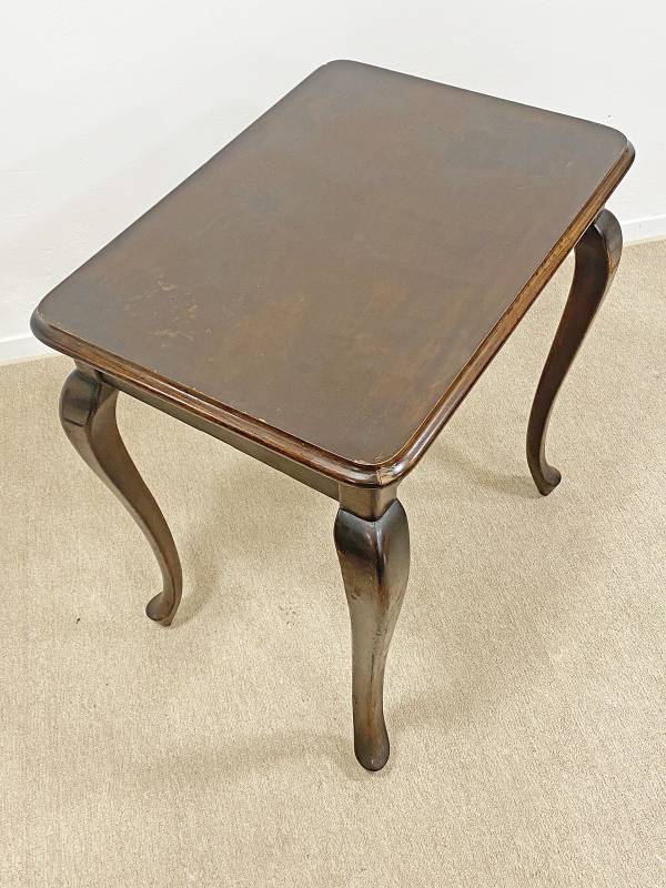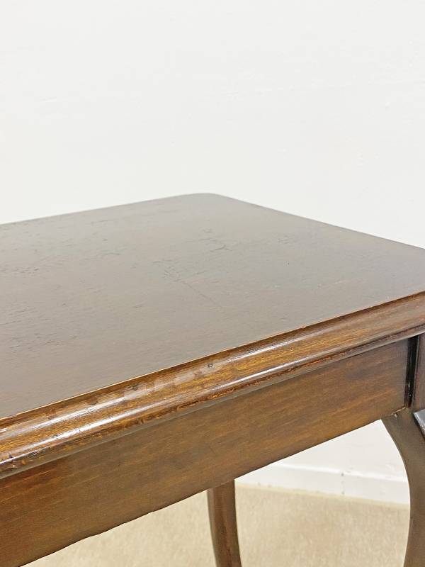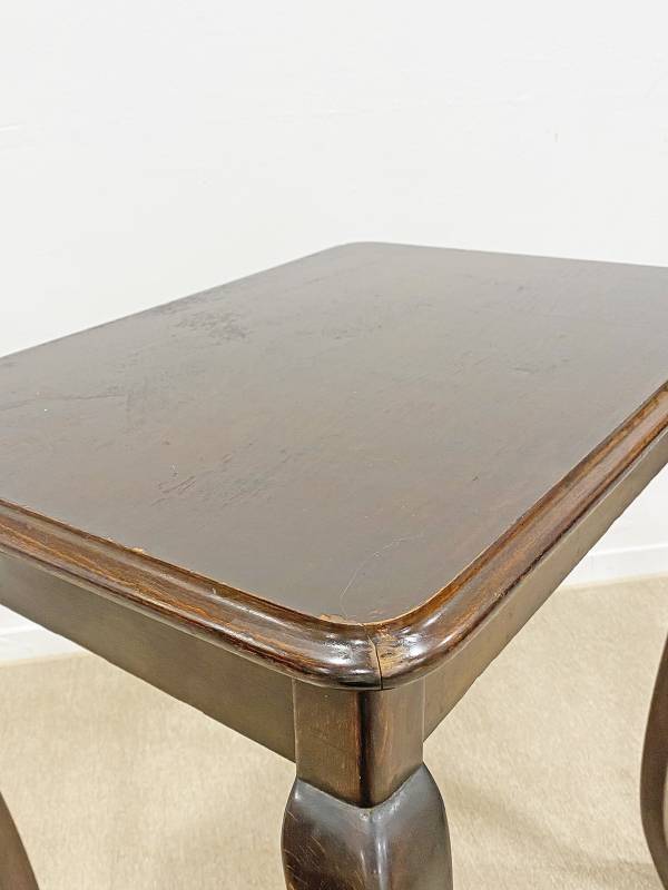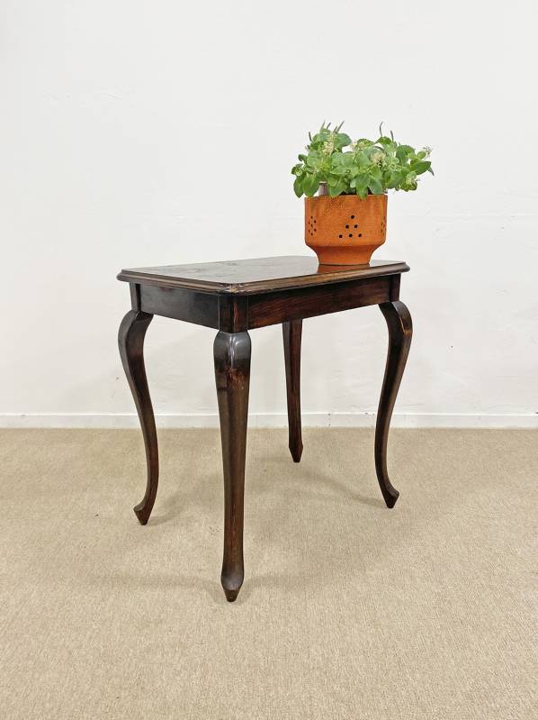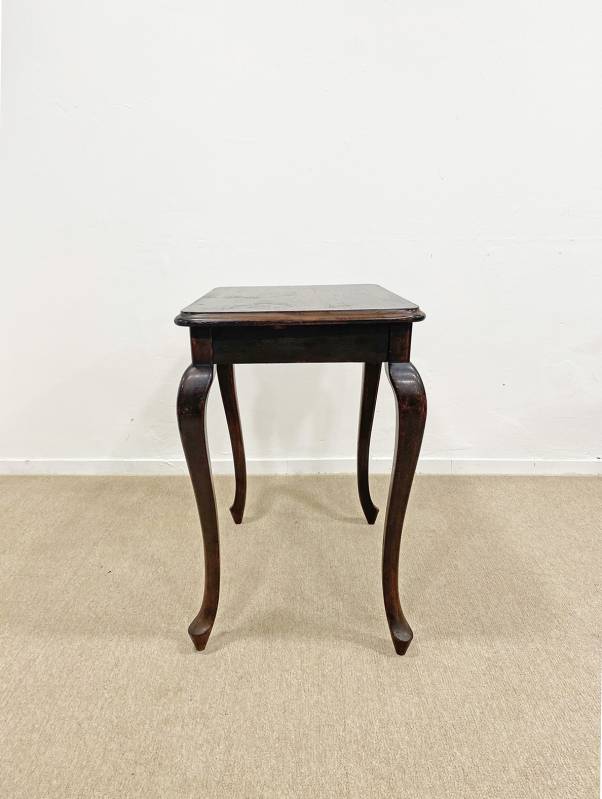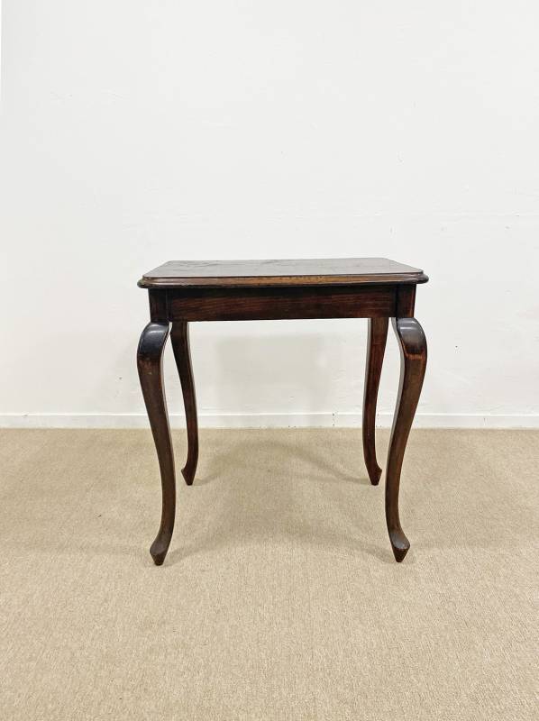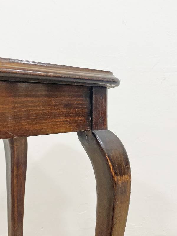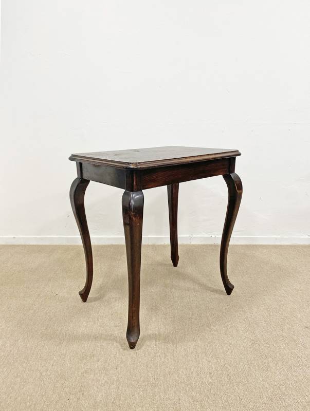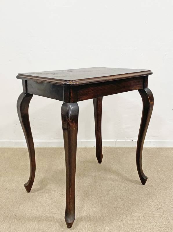 1950 körül készült neobarokk asztal. Faragott fa lábakon furnérozott, fa vázas asztallap. Finom, kecses darab, méreténél fogva remek laptopasztal, vagy dolgozó asztal lehet belőle. Eredeti funkciója szalon asztal volt.