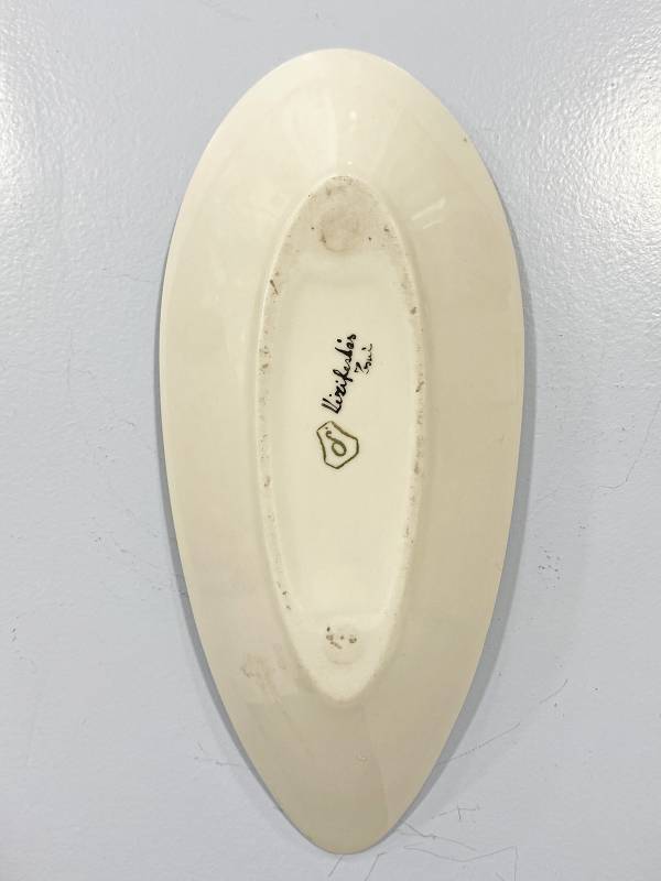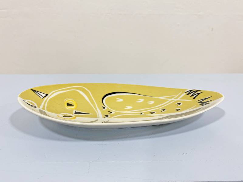 1960 körül készült, kézzel festett mázas porcelán tálka amelyen elragadó bagoly dísztés található, az időszak jellegzetes modernista megfogalmazásában.