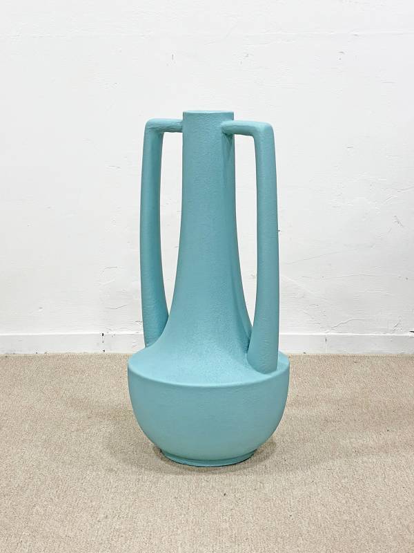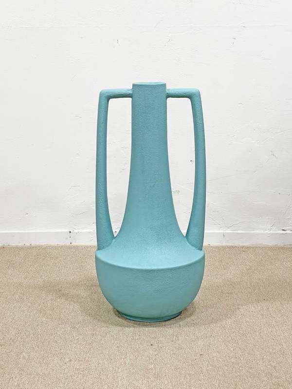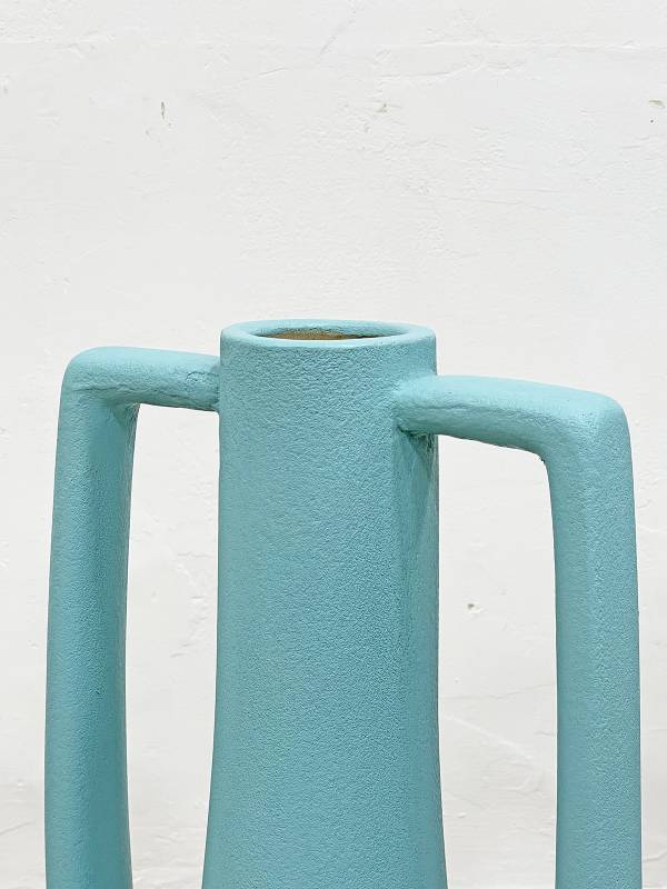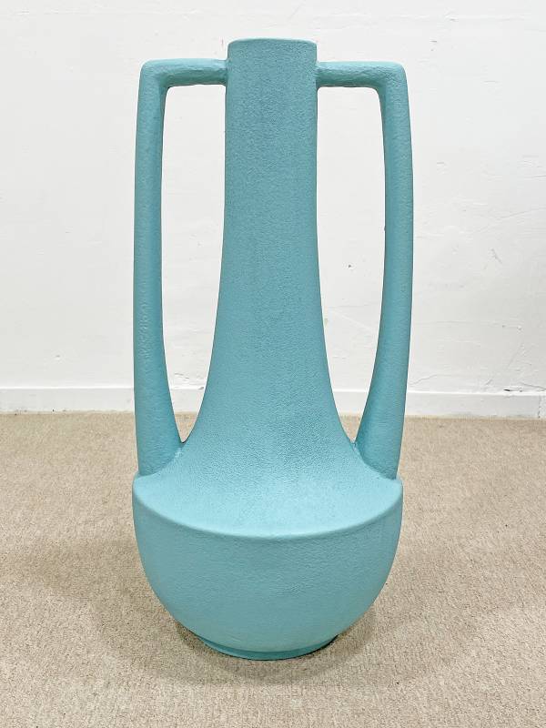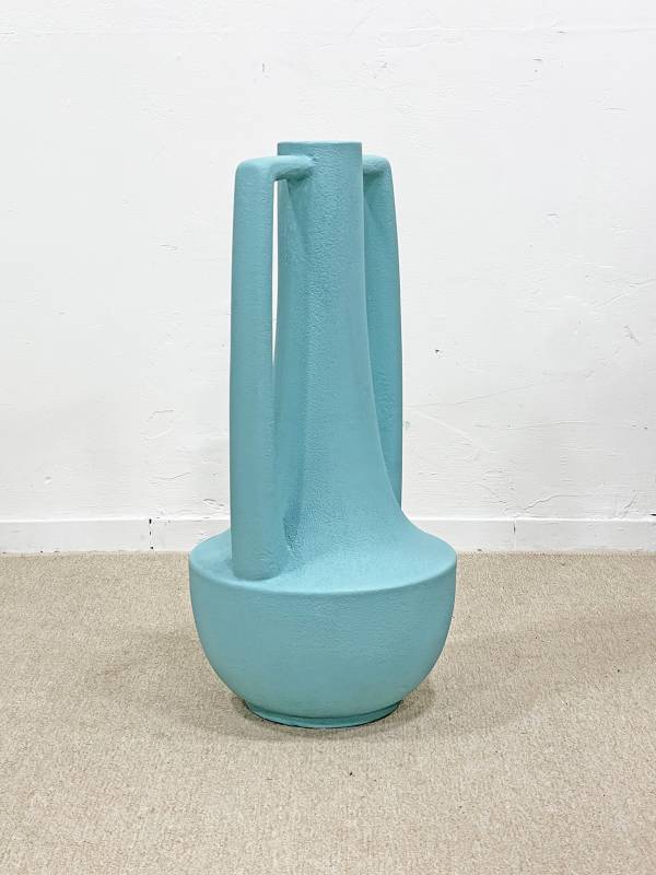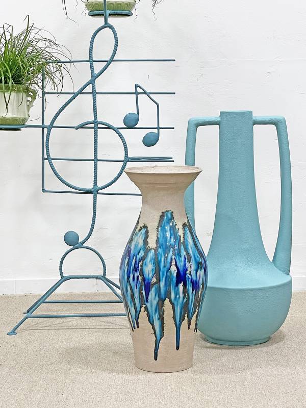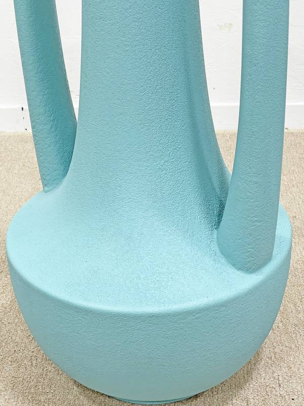 1970 körül készült, korongolt kerámia, különlegesen élénk türkiz mázzal. Rendkívül látványos forma.