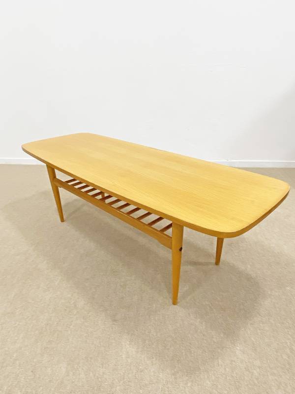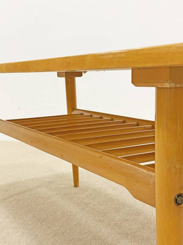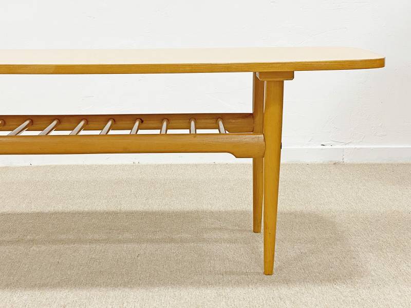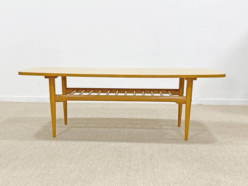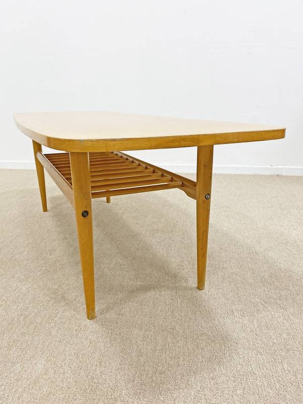 1965 körül készült, magasfényű bükkfa dohányzó asztal. Remek, jellegzetes mid-century modern forma, jégcsap lábakkal, alsó részen újságtartóval.