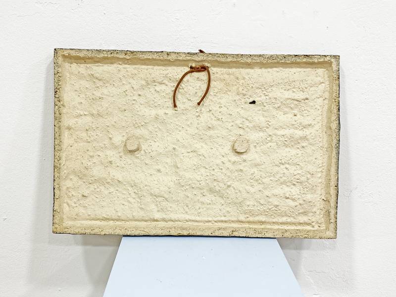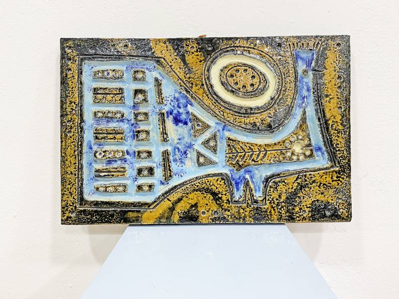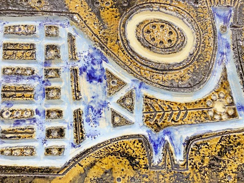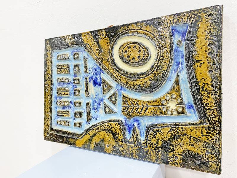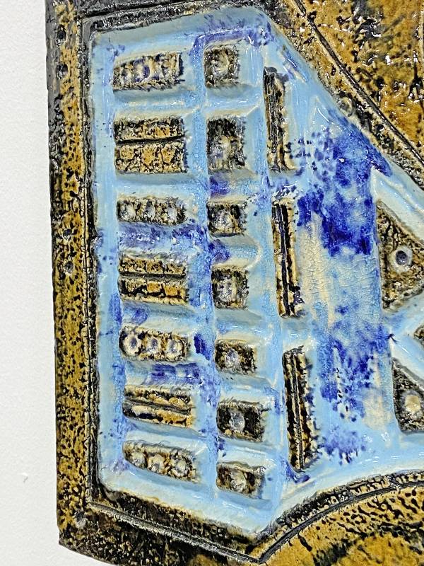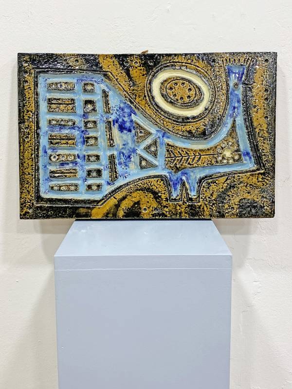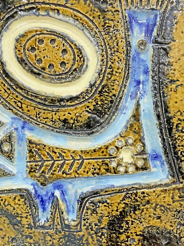1965 körül készült, kézzel festett mázas fajansz, stilizált, modernista madár díszítéssel és gyönyörű türkiz színekkel.