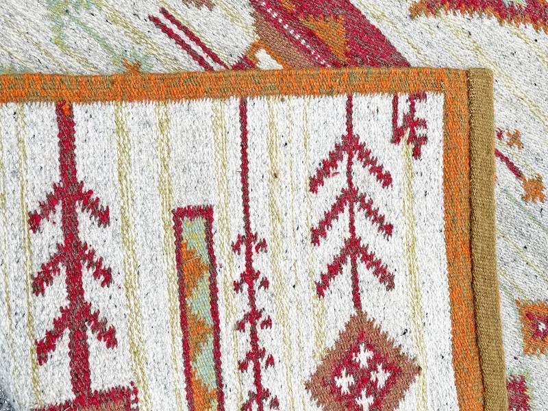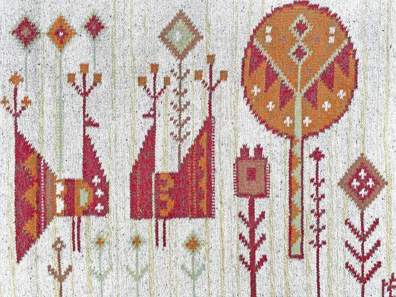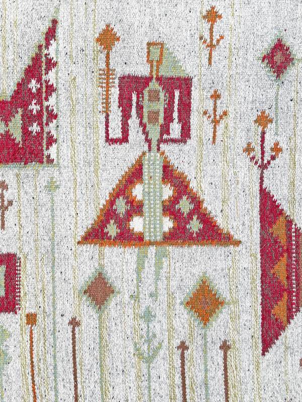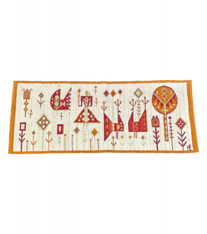 1970 körül készült, kézi szőttes faliszőnyeg gyapjú anyagból. Kislányt, fákat ábrázoló gyönyörű, stilizált, élénk, narancsos mintázattal.