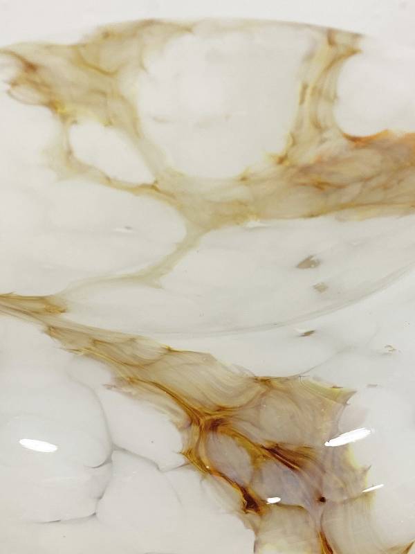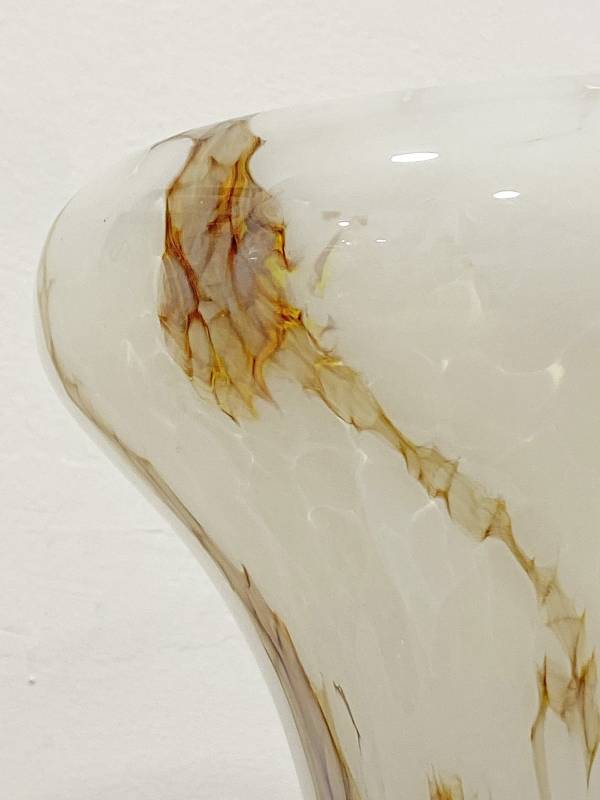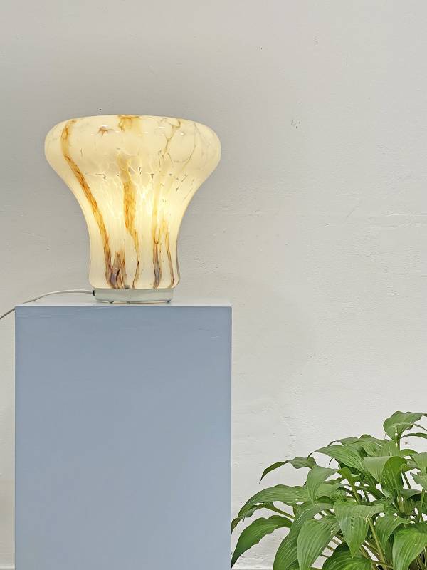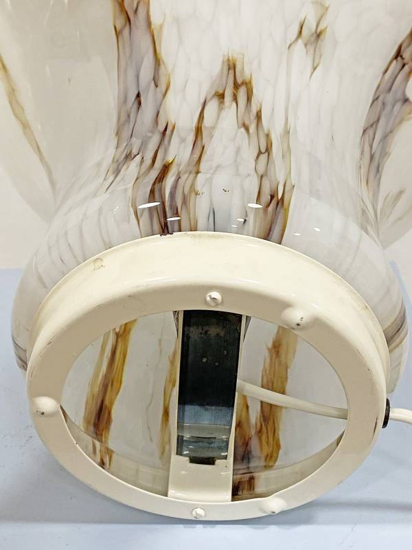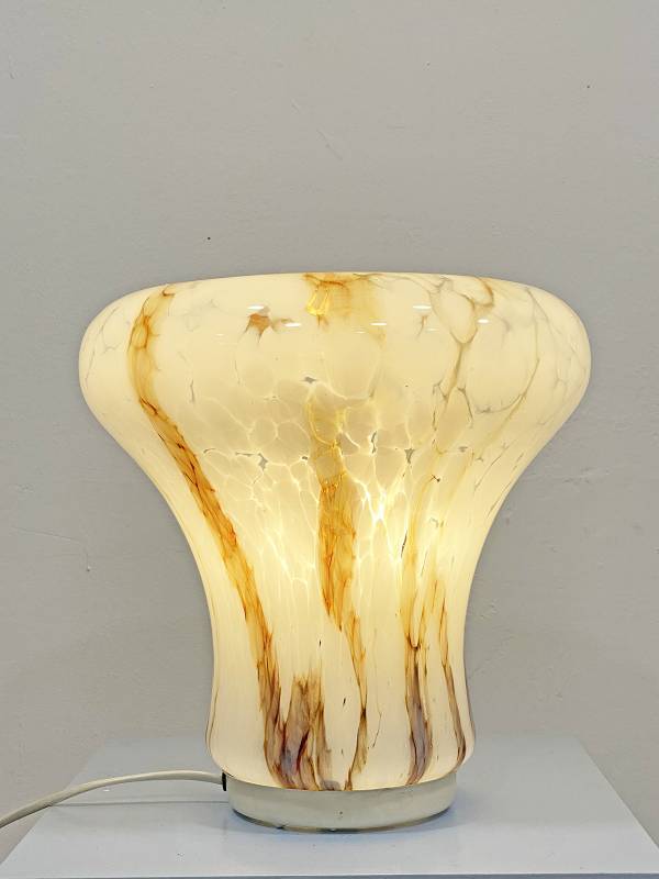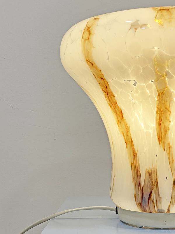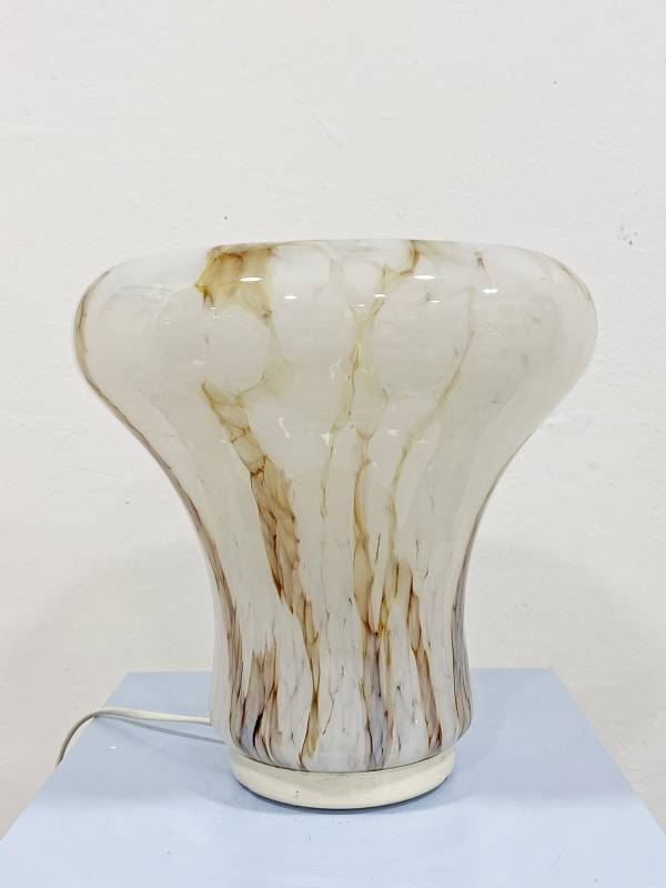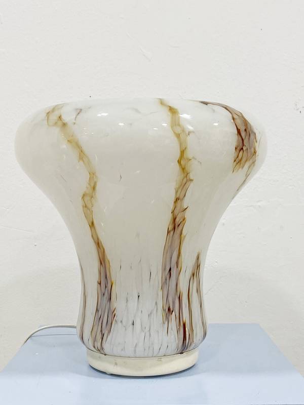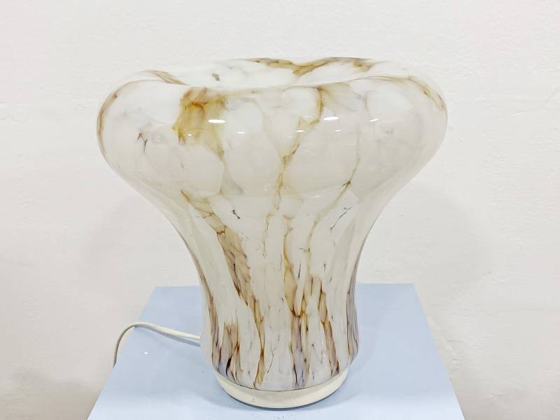 1970 körül készült, különleges formájú, Muránói, fújt üveg asztali lámpa. Gyönyörű, foltokkal díszített márványos üveg. Finom színvilágú, kellemes formavilágú asztali hangulat lámpa.