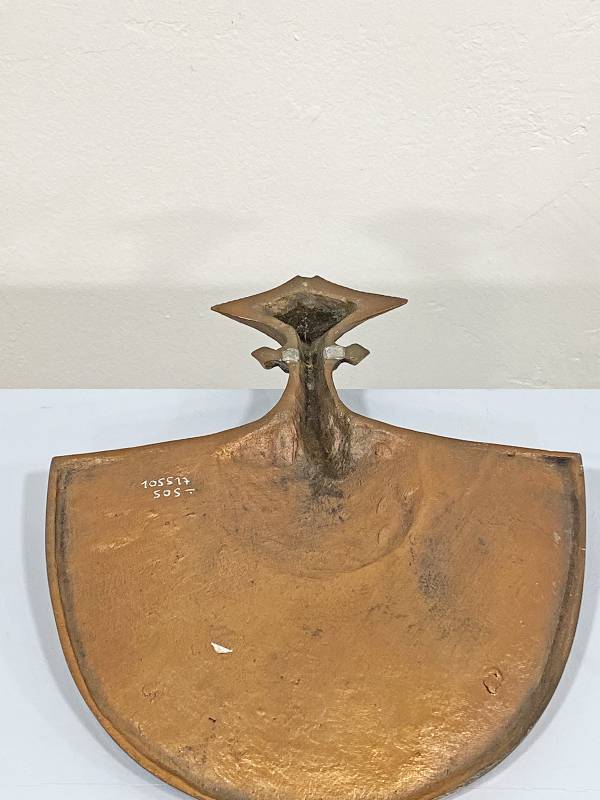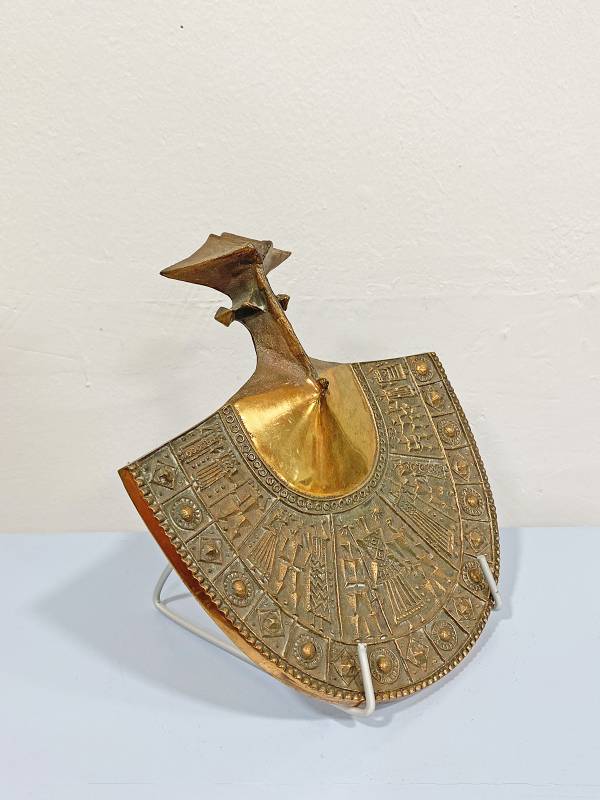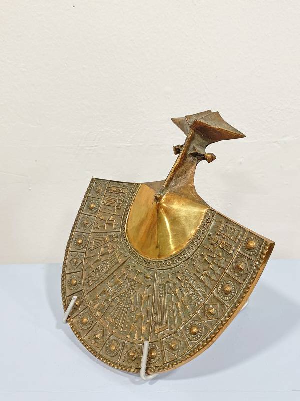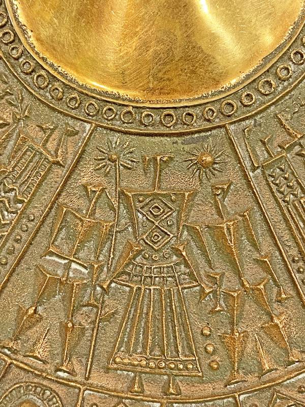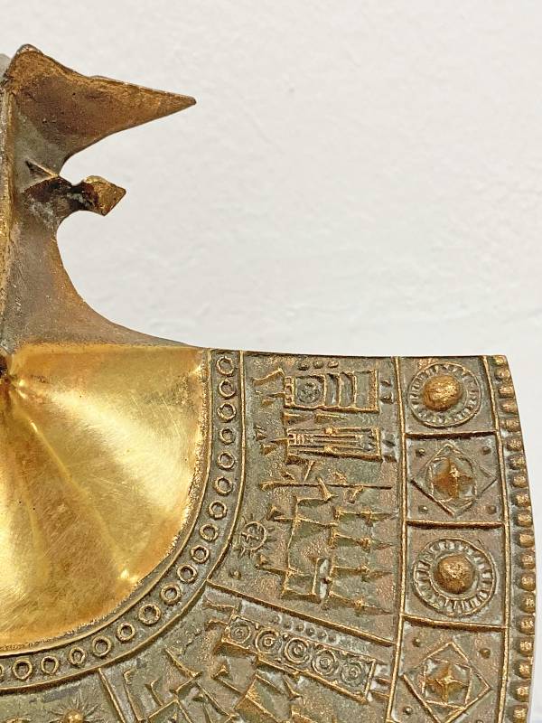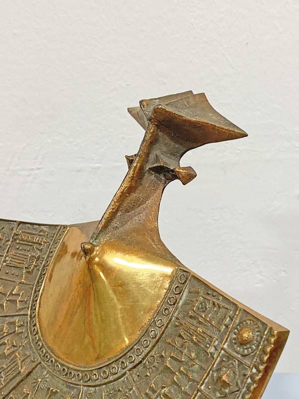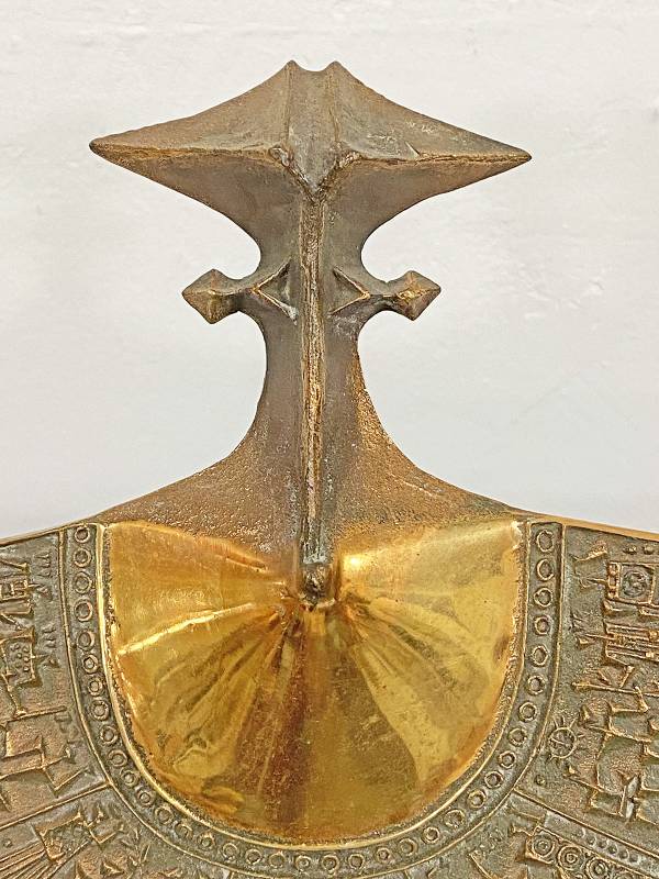 1965 körül készült, öntött, kalapált bronz plasztika. Érdekes pajzs forma, rajta alakos díszítés. Jellegzetes modernista művészet, gyönyörű mintázással, nemes anyagból.