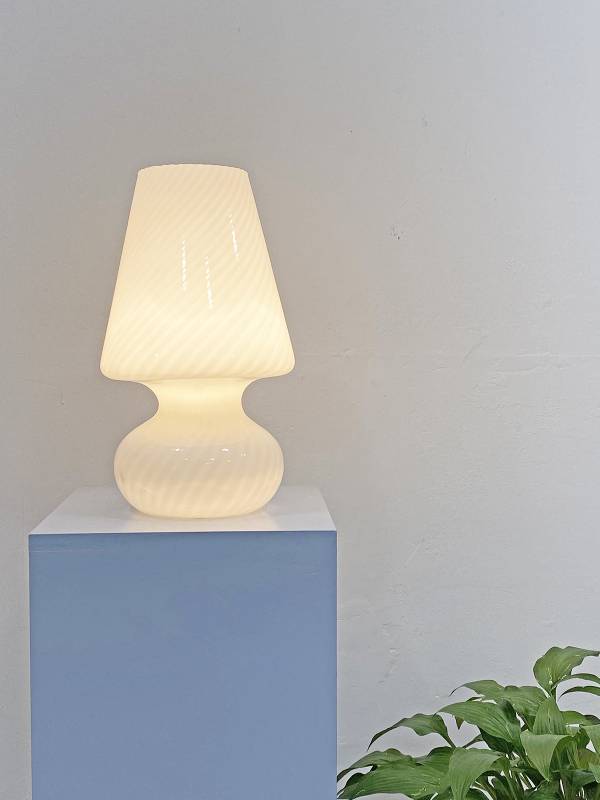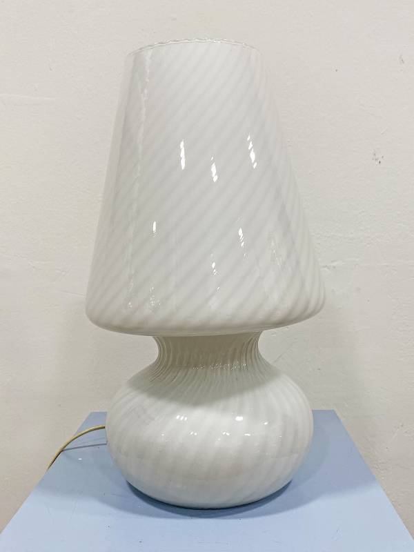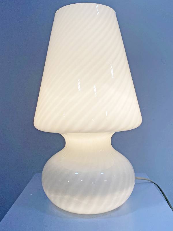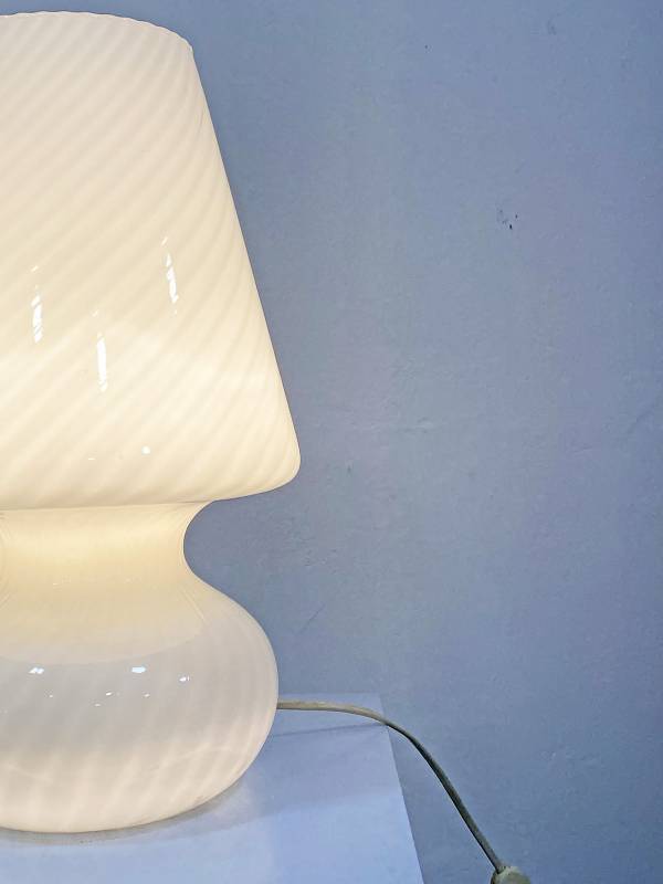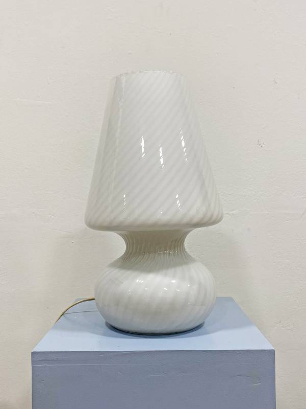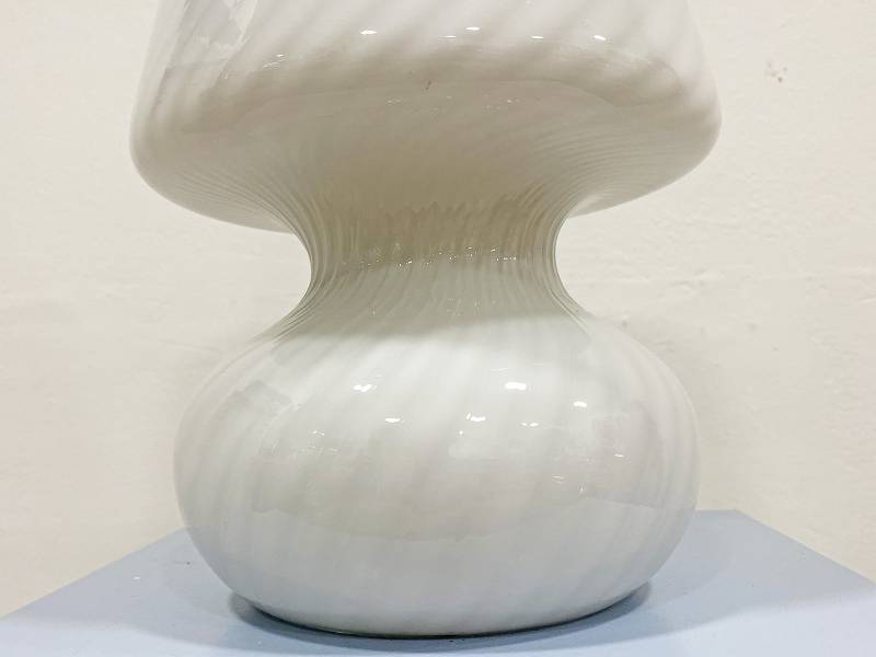 1980 körül készült, száldíszítéses (filigrán) üveg hangulatlámpa. Pazar fújt üveg, elképesztő gomba formával.