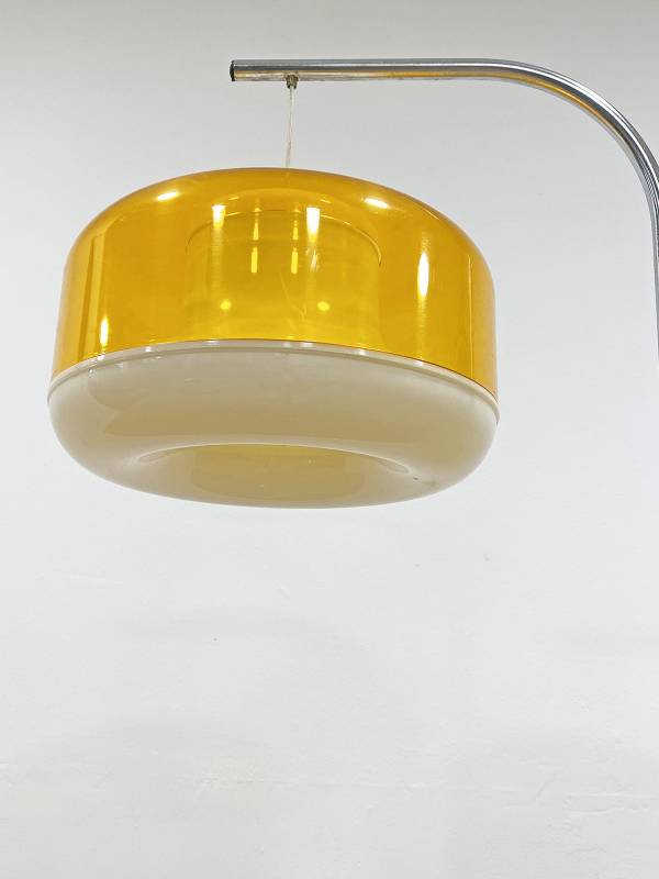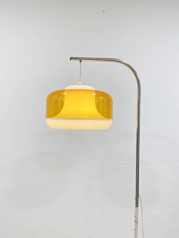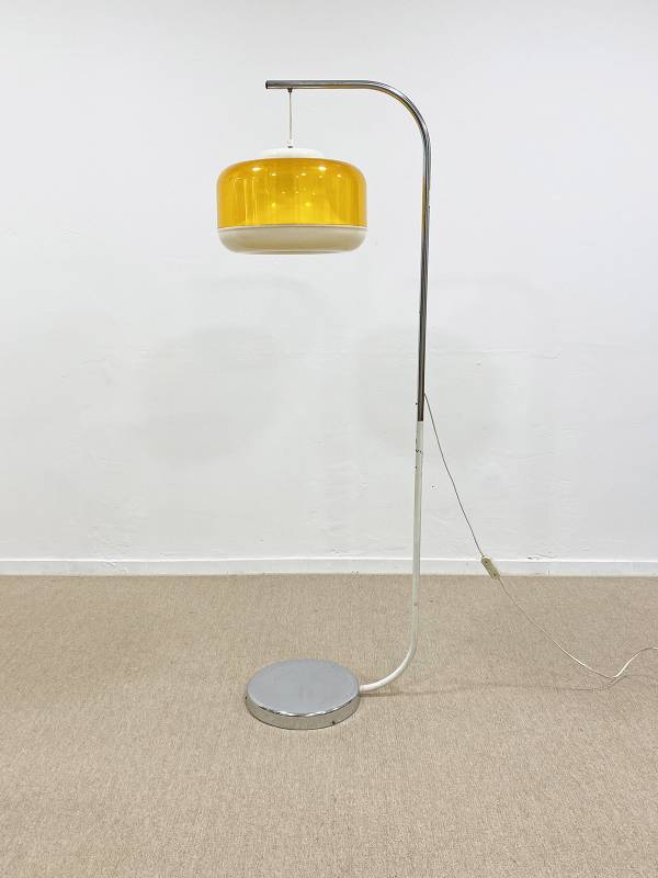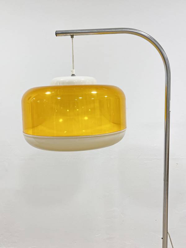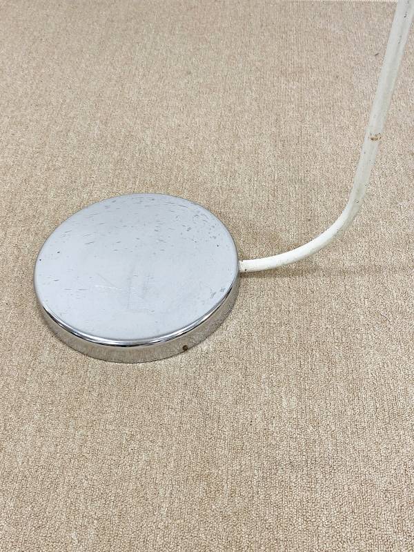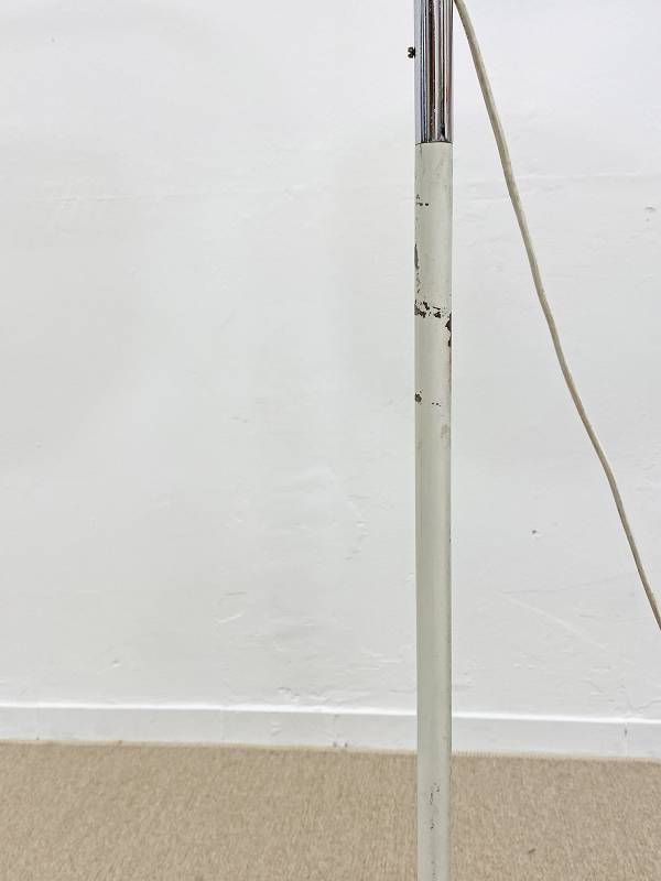 1960 körül készült, krómozott vázas állólámpa, különleges, műanyag burával. Nagyon látványos, jellegzetes űrkorszak design, amely gyönyörű fényt ad.