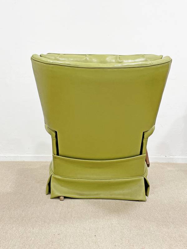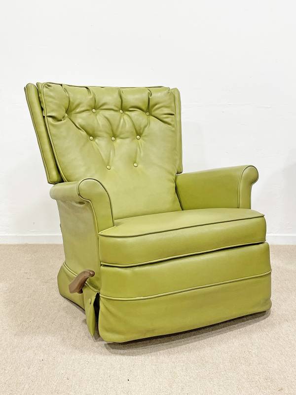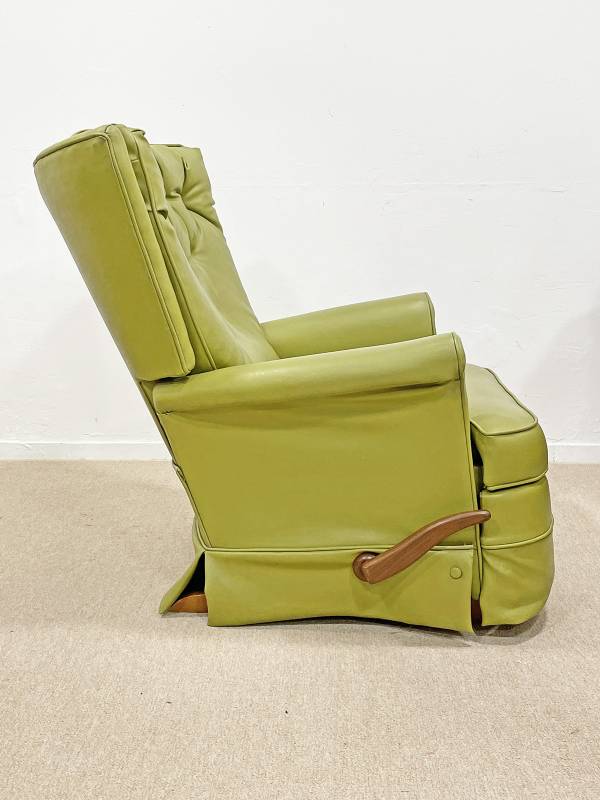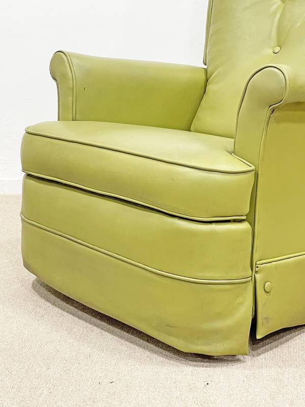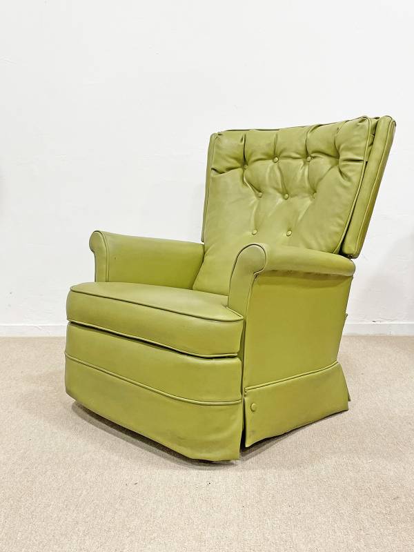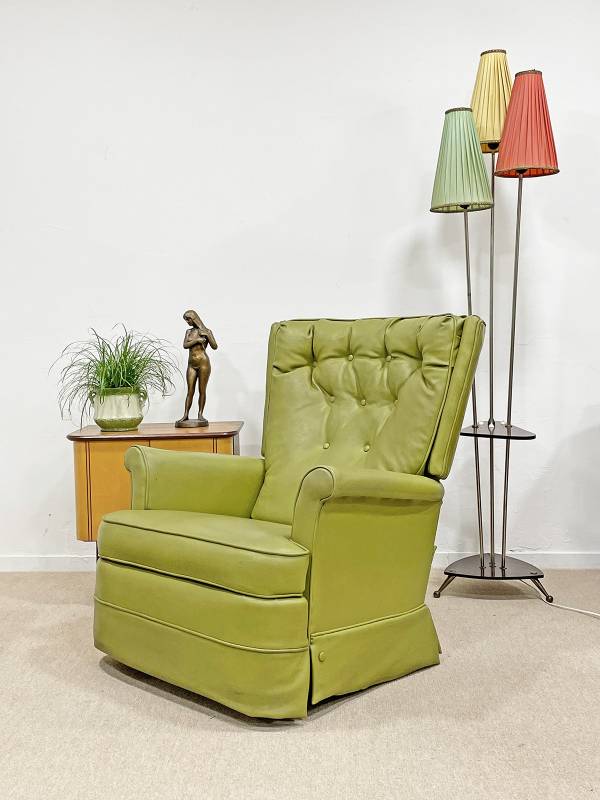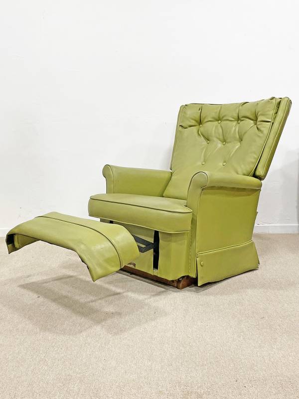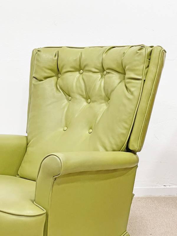 1990 körül készült, műbőr pihenő fotel. Lábtartó része felemelhető. Gombozott, háttámlája ívelt, hátradönthető.